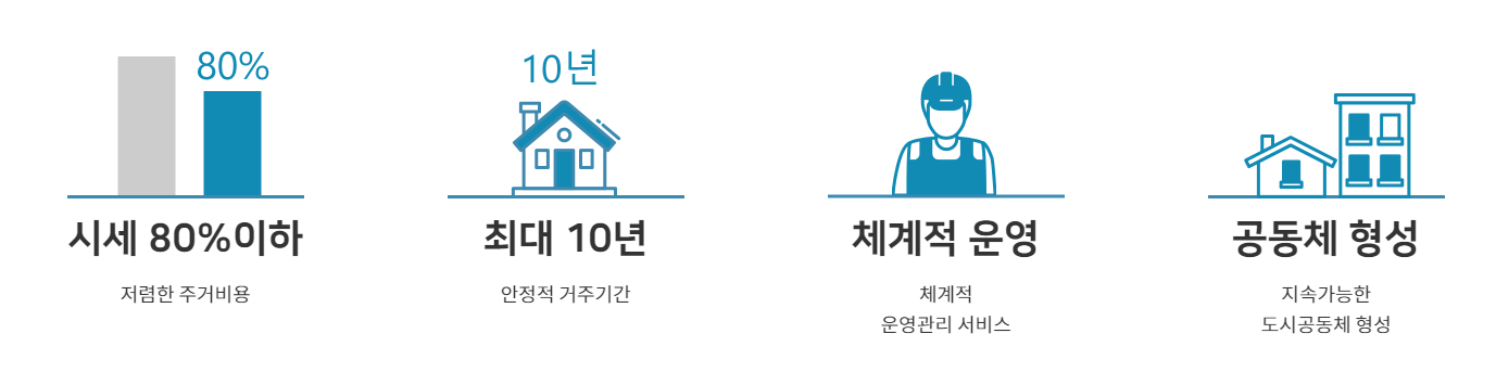 - 정부 또는 지자체가 공급하는 민관협력형 임대주택입니다. 공공이 주택을 매입하고, 사회적경제 주체인 사업 시행자가 주택을 건축하여 장기임대하는 주택입니다.